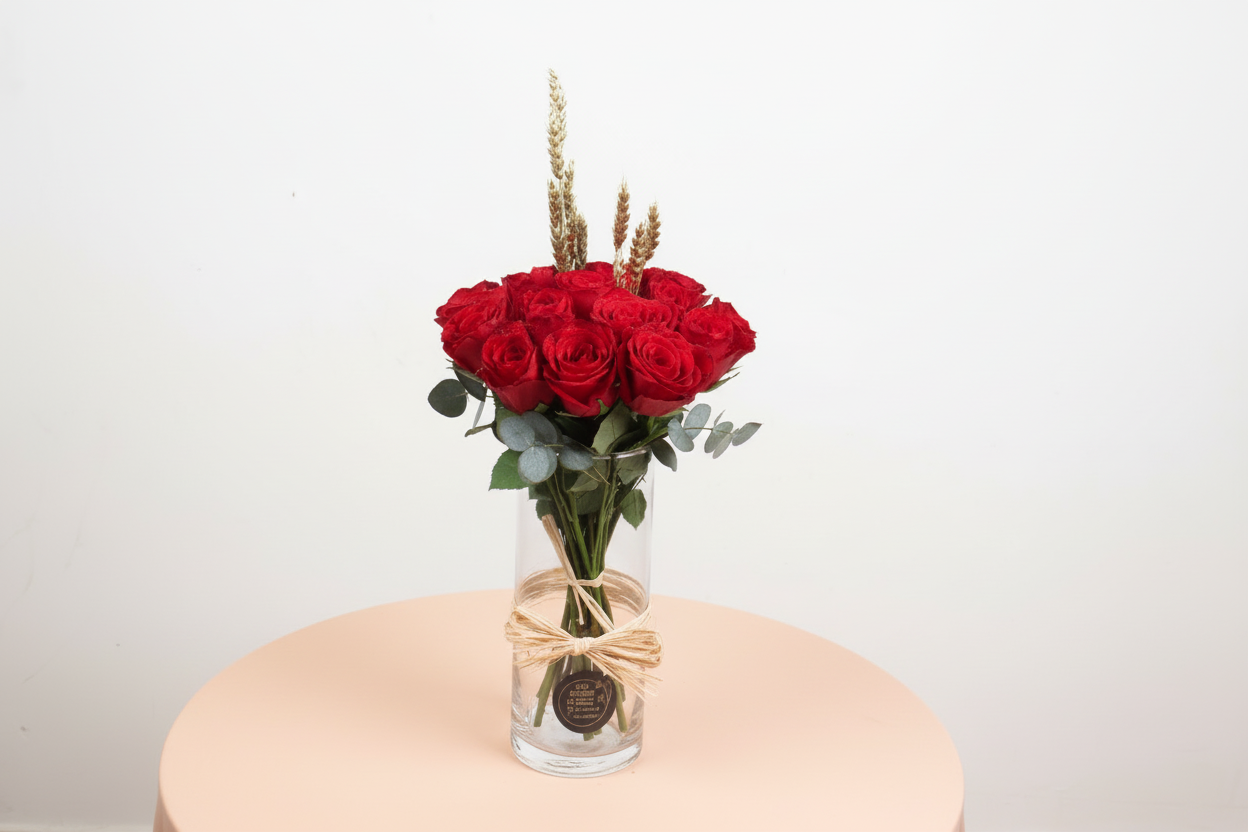 classic red rose Finished with springs of fresh wheat for a unique, rustic touch,Ideal for anniversaries or simply to express affection.