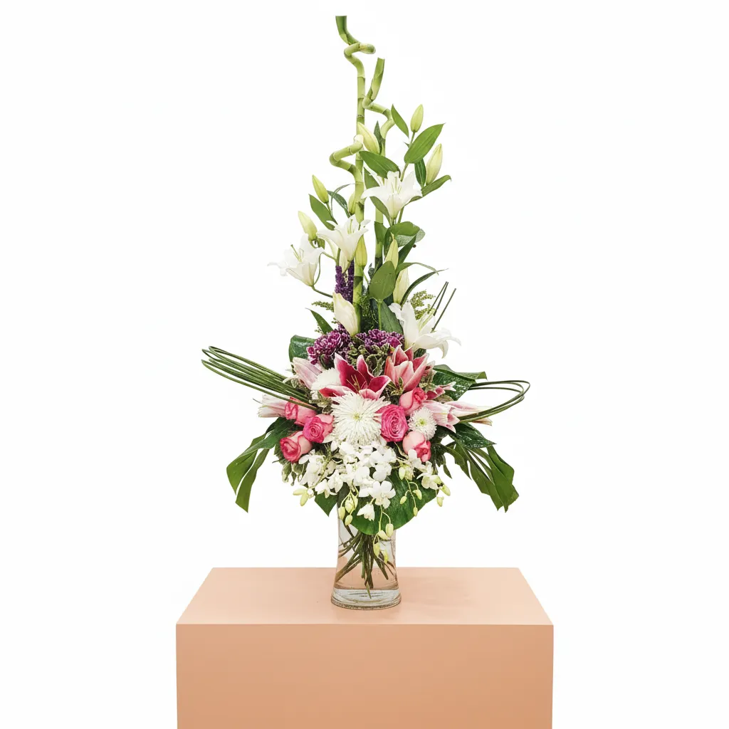 This vertical floral arrangement is a beautiful example of a formal, architectural design, likely inspired by the Japanese art of Ikebana, which is known as the “way of flowers”.