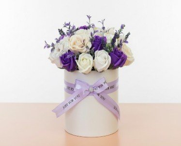 A beautiful, handcrafted arrangement of Natural fresh flowers designed as a lasting “forever gift”. The display features a mix of purple,aster and white roses with greenery accents, presented in a round white hat box.